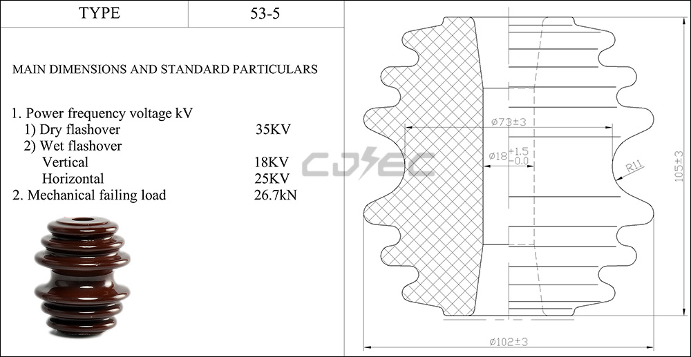 ANSI 53-4 Porcelain Spool Insulator: ANSI-standard low-voltage insulator with 105mm diameter,76mm height and 1.15kg net weight. 25KV dry flashover voltage